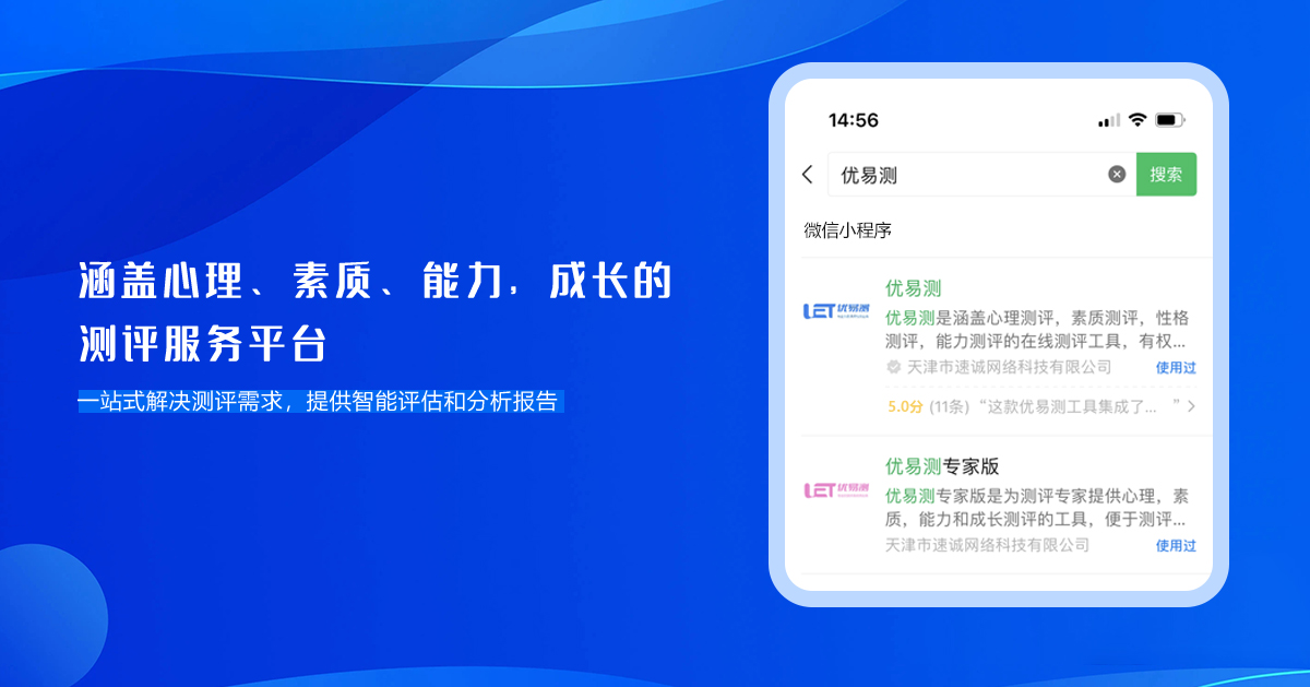 优易测,一个隶属于天津市速诚网络科技有限公司的在线测评服务品牌,自创立以来便致力于打造一个领先的智能化测评平台。该平台不仅涵盖了心理、素质、能力、成长等多种类型的全方位测评服务,还通过PC浏览器和手机端小程序等多种方式便捷地触达用户,满足不同场景下的测评需求。无论是学校、企业、心理服务机构还是个人自助测评,优易测都能提供专业、高效、便捷的测评体验。
