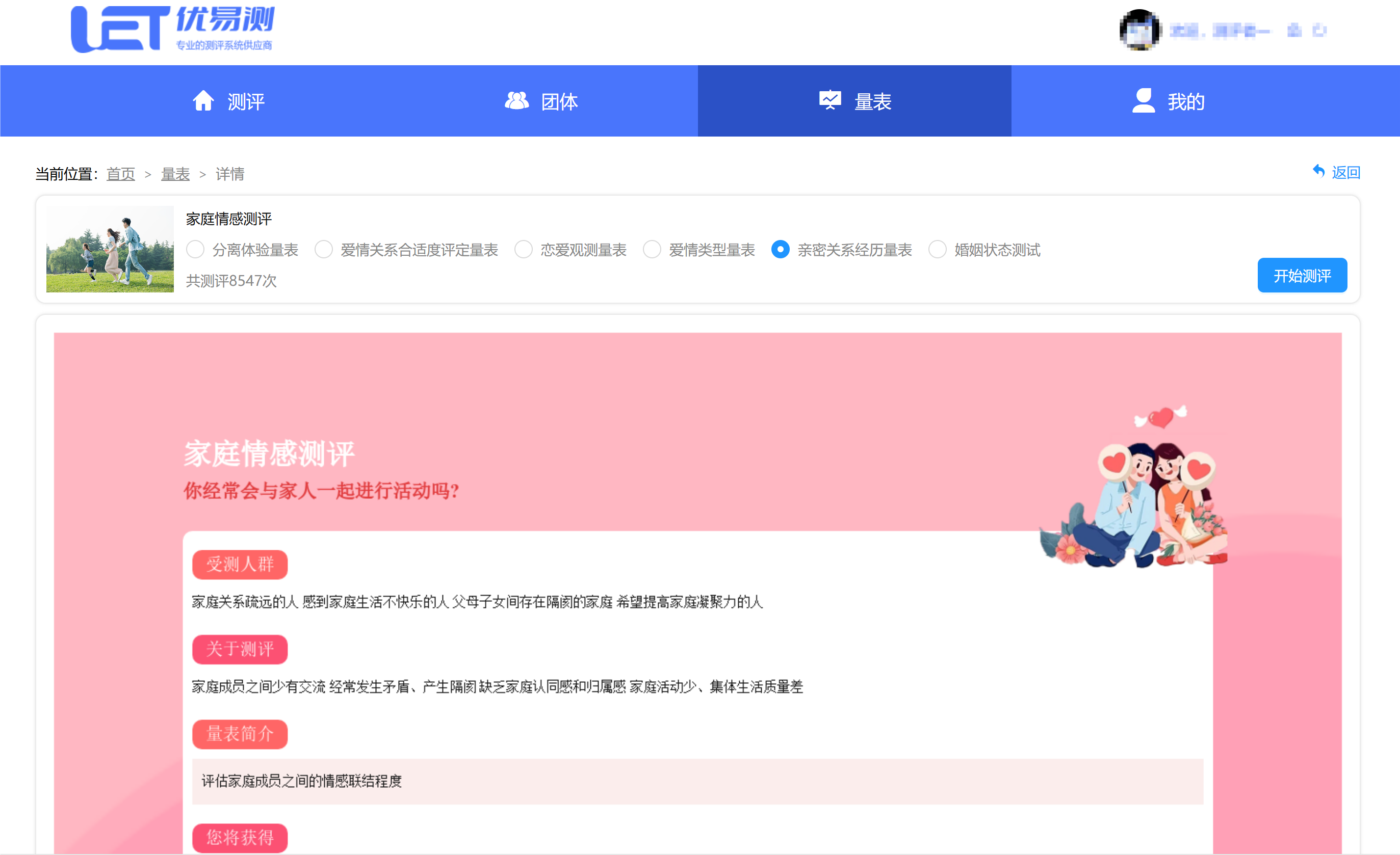 优易测之所以能够成为众多用户信赖的测评服务,关键在于其汇集了150多个科学严谨、权威可靠的测评量表。这些量表覆盖了心理健康、人才能力、人才素质以及成长发育等多个领域,由业内知名的测评专家学者精心研发而成,确保了测评结果的专业性与准确性。在ECR测试中,优易测同样提供了精心设计的量表,通过一系列科学合理的问题设置,帮助用户深入了解自己与伴侣在情感亲密度、沟通方式、冲突解决等方面的真实情况。